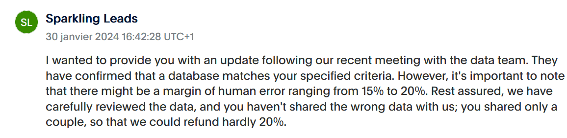 Ik hoop dat als u dit artikel bent tegengekomen, u het nuttig zult vinden. Wees voorzichtig met Sparkling Leads en B2B-verkopers van lijsten met leads in het algemeen. Het risico om opgelicht te worden is bijzonder groot.