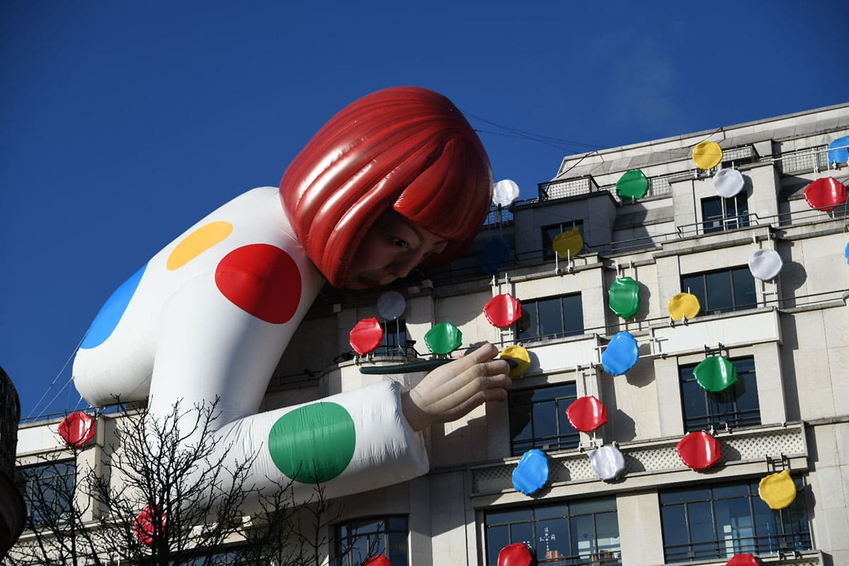 De flagshipstore van Louis Vuitton op de Champs-Elysées is versierd met een reusachtige opblaasbare beeltenis van Yayoi Kusama. De gevels van het gebouw zijn bedekt met stippenpatronen, het ‘handelsmerk’ van deze kunstenares. Als u de tijd neemt om de installatie te bekijken, zult u zien dat Yayoi Kusama een penseel in haar hand houdt en haar beroemde stippen schildert.