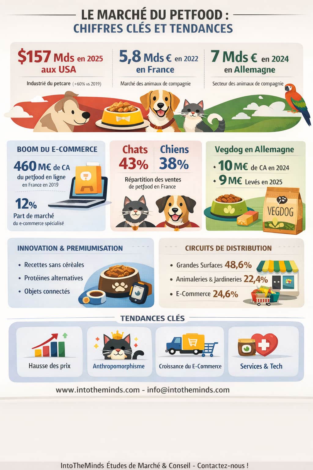 Le marché de l’alimentation pour animaux de compagnie (la « petfood ») est entré depuis une dizaine d’années dans une période de transformations intenses. Ces transformations sont le résultat des innovations technologiques, des changements de comportements des propriétaires et de la reconfiguration des circuits de distribution pendant et après le Covid. En tant que cabinet d’étude de marché, nous avons étudié à plusieurs reprises le marché de la petfood. Nous avons compilé les derniers chiffres et statistiques et vous livrons une analyse qui explore les tendances qui façonnent aujourd’hui l’univers de la nutrition animale, des habitudes d’achat aux stratégies d’innovation, en passant par l’essor fulgurant du commerce en ligne.