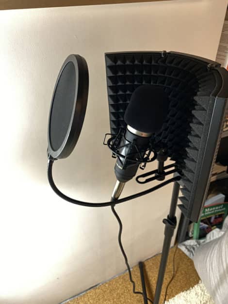 A la réflexion, j’aurais sans doute été plus avisé d’acheter un bras télescopique pour les micros mais dans ce cas j’aurais dû faire un trait sur le bouclier acoustique. Quel est le problème avec les pieds des boucliers acoustiques ? Ils gênent parfois les invités quand ils sont assis. Pour se rapprocher du micro la position du corps est parfois contraignante et il y a toujours risque de toucher le pied et de faire du bruit. A vous de voir ce que vous préférez.