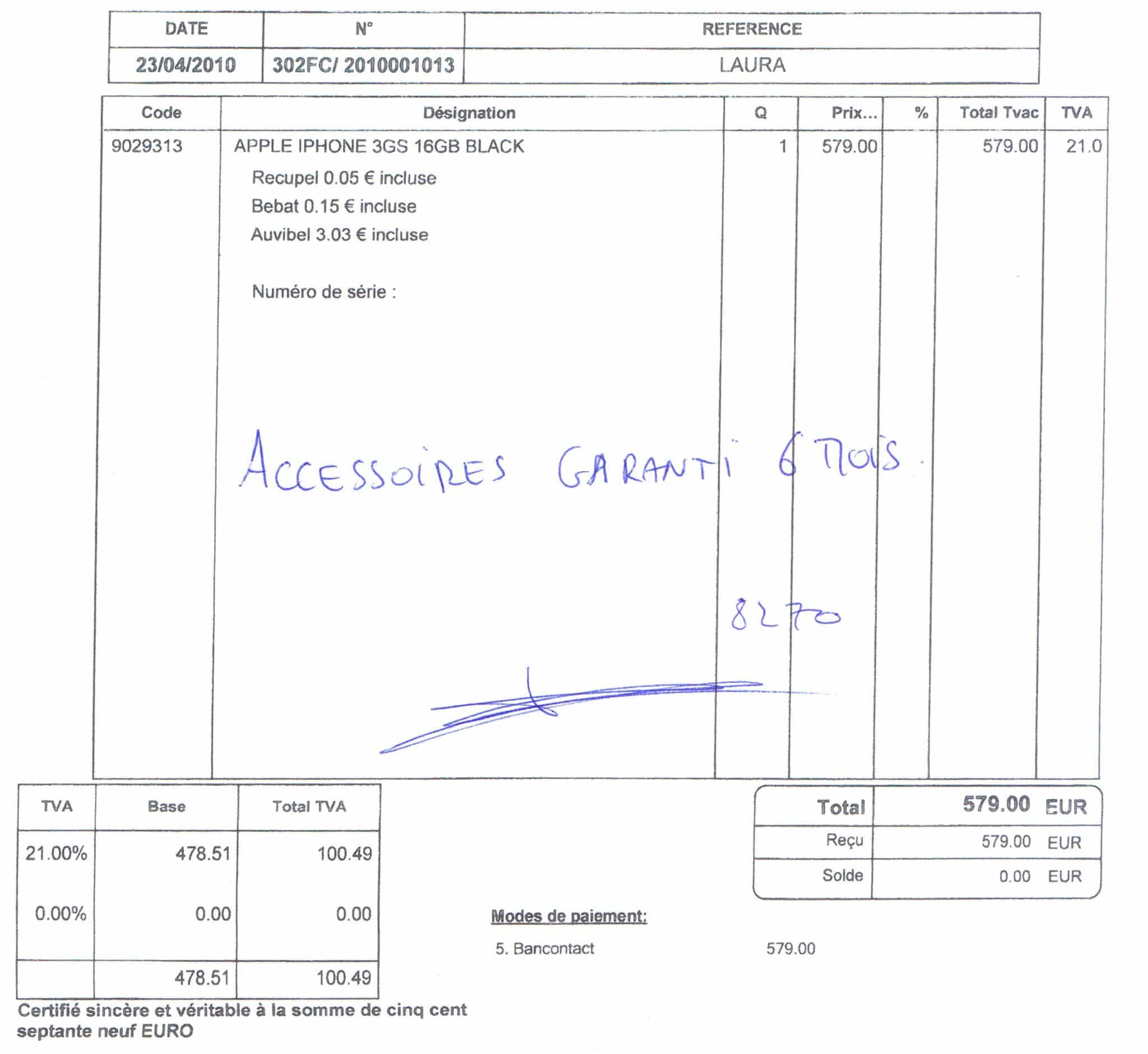 Que Mobistar me remercie. Leurs employés ont grâce à moi appris où trouver et comment lire les conditions générales de vente Mobistar. Ces dernières stipulent à l’article 4.2 que la garantie est de 2 ans alors que les employés de l’opérateur s’entêtent à répéter qu’elle n’est que de 6 mois (pour votre information les conditions de vente en magasin sont imprimées au dos de chaque facture émise dans un point de vente Mobistar).