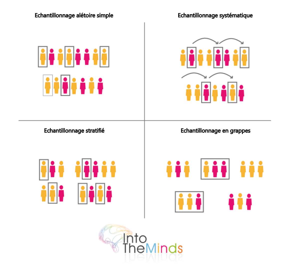 Réaliser une étude de marché suppose de sélectionner des participants aux différentes études à mener, qu’elles soient qualitatives ou quantitatives. Ces échantillonnages peuvent être soit probabilistes soit non-probabilistes. Grâce à cet article vous comprendrez les différents types d’échantillonnages, leurs différences, ainsi que leurs applications. Nous commencerons par traiter des approches aléatoires, le plus souvent utilisées dans les sondages. Dans une deuxième partie nous aborderons les méthodes non-aléatoires, sur lesquelles reposent toutes les études qualitatives (mais pas seulement). Vous trouverez au milieu de cet article une représentation graphique des différents types d’échantillonnages probabilistes.