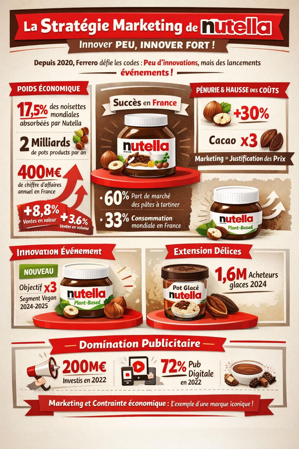 Comment une pâte à tartiner née dans l’Italie d’après-guerre est-elle devenue l’une des marques les plus puissantes au monde ? La stratégie marketing de Nutella mérite qu’on s’y attarde. Depuis 2020, le groupe Ferrero a développé une approche singulière qui défie les codes traditionnels du secteur alimentaire. Cette stratégie repose sur un paradoxe : innover peu, mais innover fort. Chaque lancement devient un événement soigneusement orchestré, tandis que la marque maintient une pression publicitaire constante pour préserver son leadership.