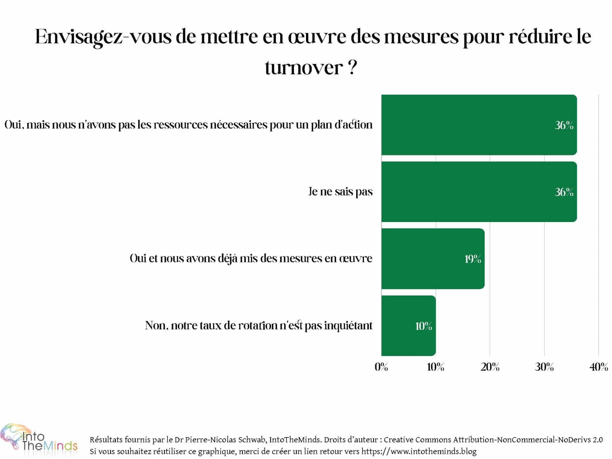 Tout aussi étonnant est le pourcentage d’entreprises qui sont conscientes de l’enjeu mais qui ne font rien. 36% des entreprises déclarent en effet envisager de mettre en œuvre des actions mais ne pas avoir les ressources nécessaires. En d’autres termes, elles attendent patiemment que le risque d’un départ se réalise. C’est extrêmement dangereux car la matérialisation du risque est particulièrement dévastatrice, surtout dans les TPE/PME. Un ou deux employés qui partent, et c’est souvent tout le fonctionnement de l’entreprise qui est affecté.