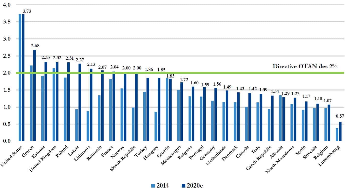 Un sentiment d’insécurité va se développer en Europe qui entraînera la hausse des dépenses militaires. Les objectifs de l’OTAN, que la plupart des pays n’atteignent pas (voir graphique ci-dessous), pourront être rattrapés à la condition d’investissements massifs. Ces derniers ne pourront se faire qu’au prix de l’accroissement de la dette des États membres, ce qui fragilisera encore plus leur situation budgétaire.